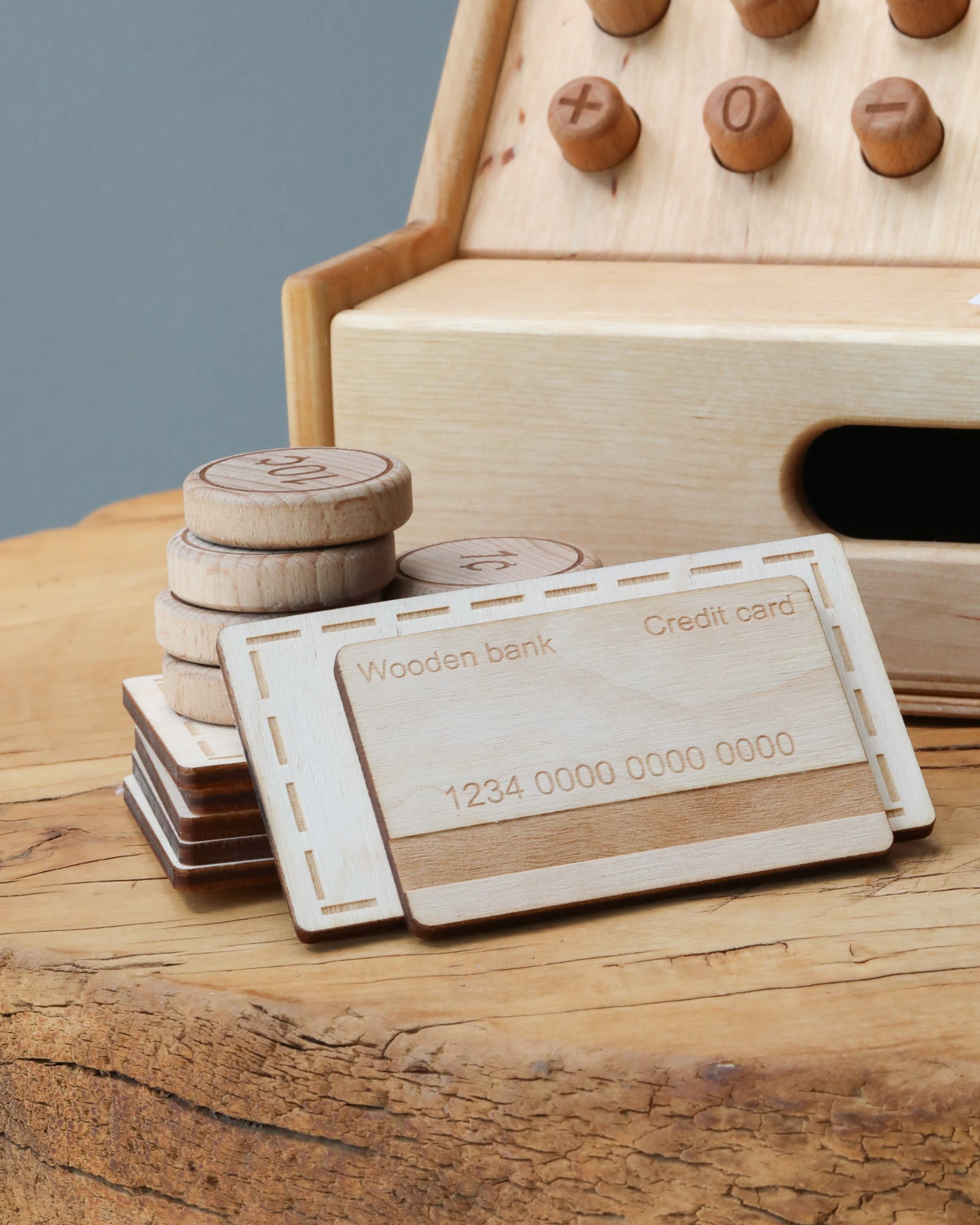 The wooden cash register is made from sustainably sourced wood. Designed with a drawer, buttons and a board with a card swipe. Comes with four lemon coins.